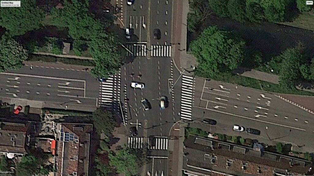 When this intersection in the Hague was converted to a fully “protected design,” the crossing distance was reduced from 17 to 10 meters, which can reduce the required duration of the pedestrian phase by around 7 seconds.