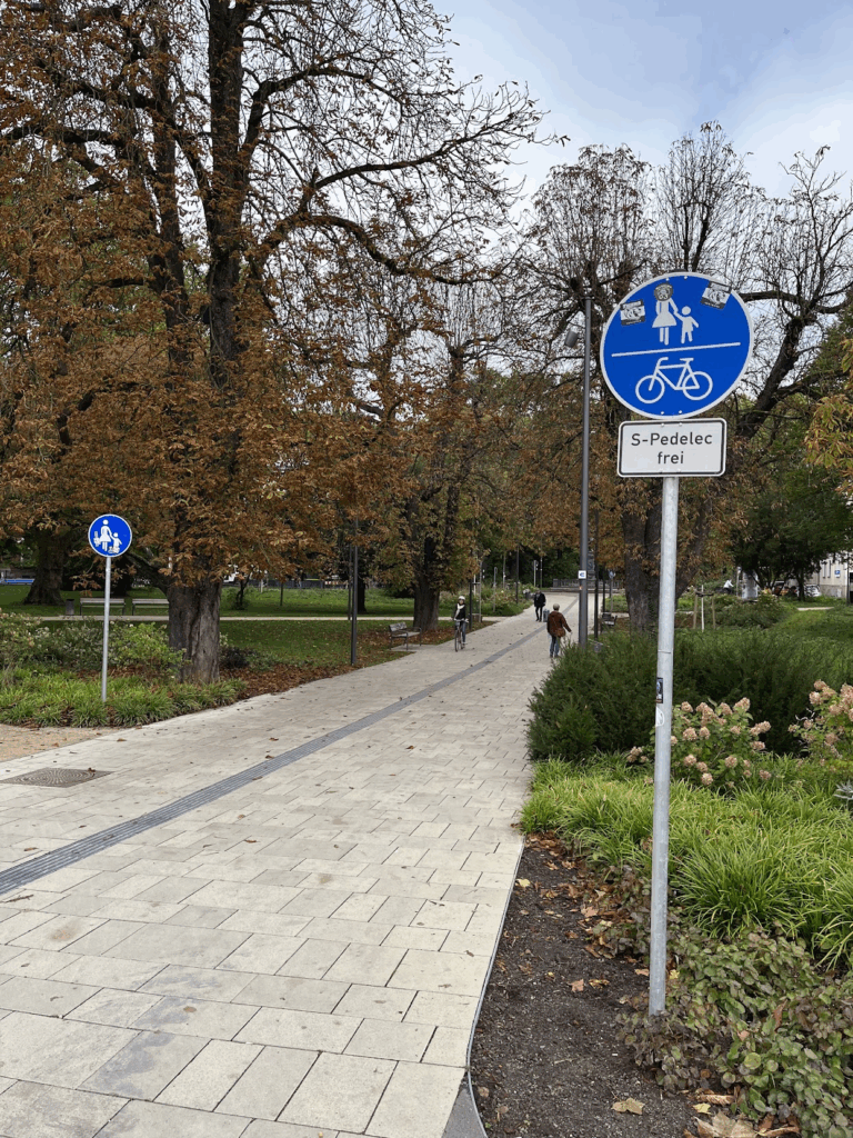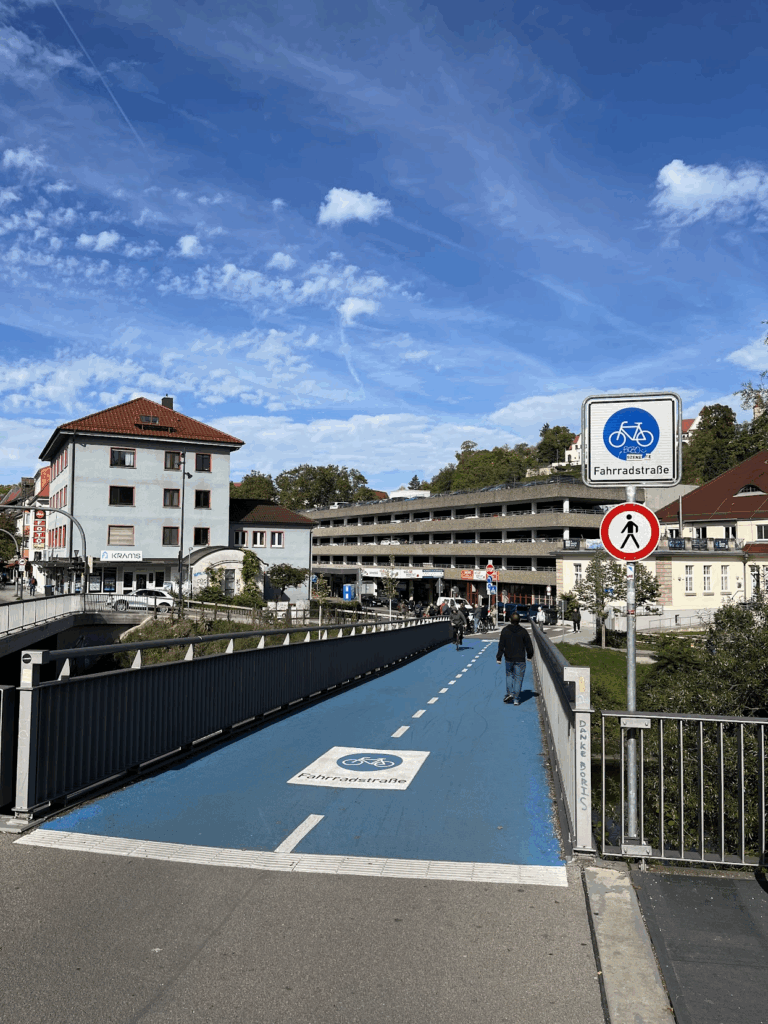 However, even in this innovative city, some challenges became apparent. The demands of federal funding (Fördermittel) often dictate infrastructural choices, rather than the needs on the ground. Like in Rheine, Tübingen is building bicycle streets (Fahrradstraßen) in places that actually need separated pedestrian and cycle paths, simply because funding is available for one and not the other. This leads to weird situations, like this one Robin stumbled upon: