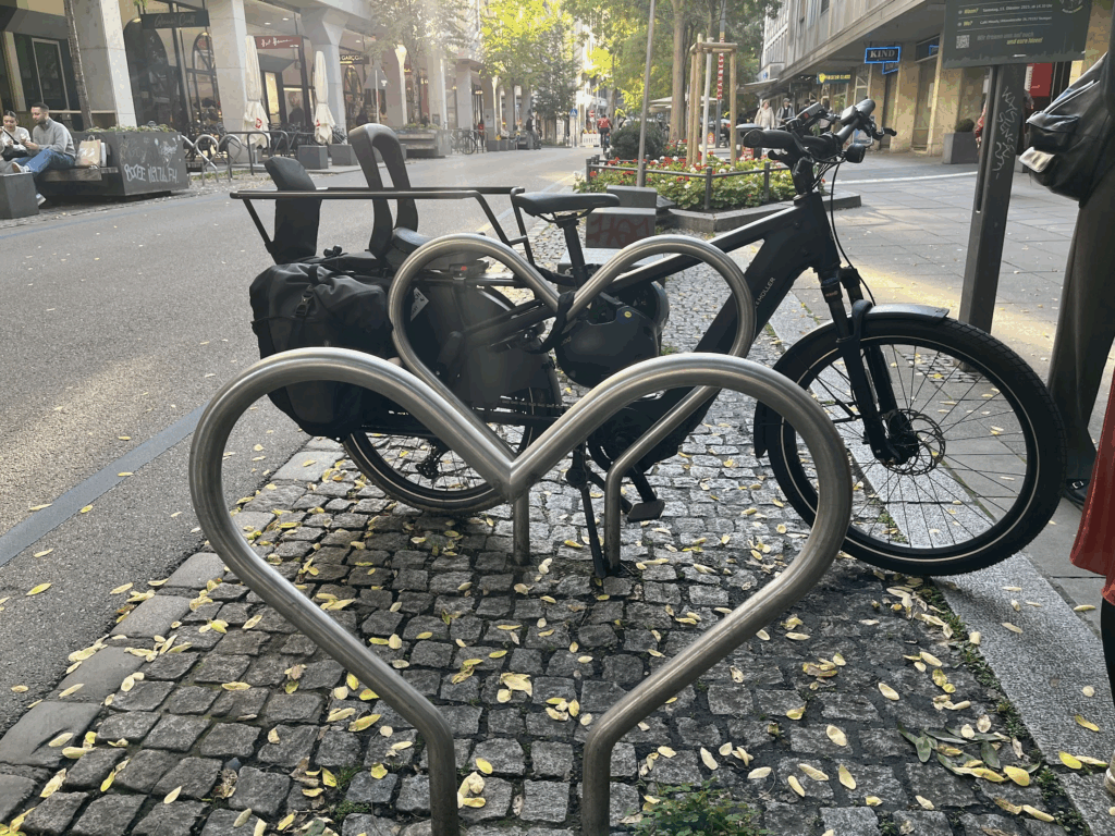 Fortunately, the walking tour with the cycle team was a more positive experience. With an enthusiastic guide, they visited some early attempts at a bicycle street with a modal filter, a cute heart-shaped bicycle stand in front of the marriage office, and the Superblock Versuch at Augustenstraße.