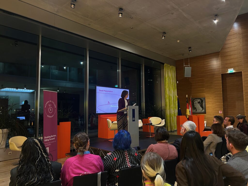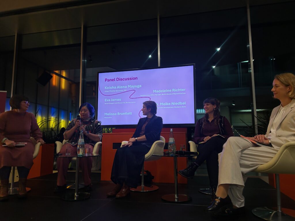 The atmosphere remained vibrant as actress and poet Salber Lee Williams performed an ode to the joy of cycling titled, “This is joy, bro.” This set the stage for a remarkable panel of four women who reflected on the core insights of the book: Eva James (social researcher, Netherlands), Madeleine Richter (Head of Office to Oda Hassepaß, Berlin House of Representatives), Meike Niedbal (Head of Corporate Development at Deutsche Bahn and former State Secretary), and Keisha Alena Mayuga (Move As One Coalition, Philippines, and GIZ advisor).
