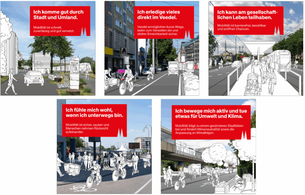 Five target visions for mobility in Cologne aim to bring together different perspectives and provide a clear framework for orientation. Together, they form a guiding vision that informs further planning. The guiding vision process led to intensive exchanges over several rounds of participation. Bringing together diverse opinions was challenging but provided a stable foundation for the next steps. The visual presentation of the target visions (see graphic below) and the first-person perspective wording also helped Cologne’s citizens to identify with the visions for the future.